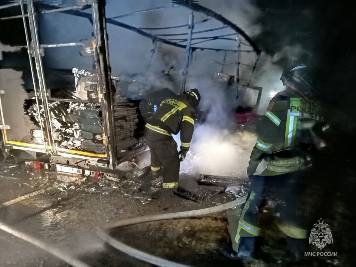 О пострадавших не сообщается, но грузовой автомобиль выгорел полностью, также пострадал перевозимый груз. Что стало причиной ДТП — в настоящий момент выясняется.