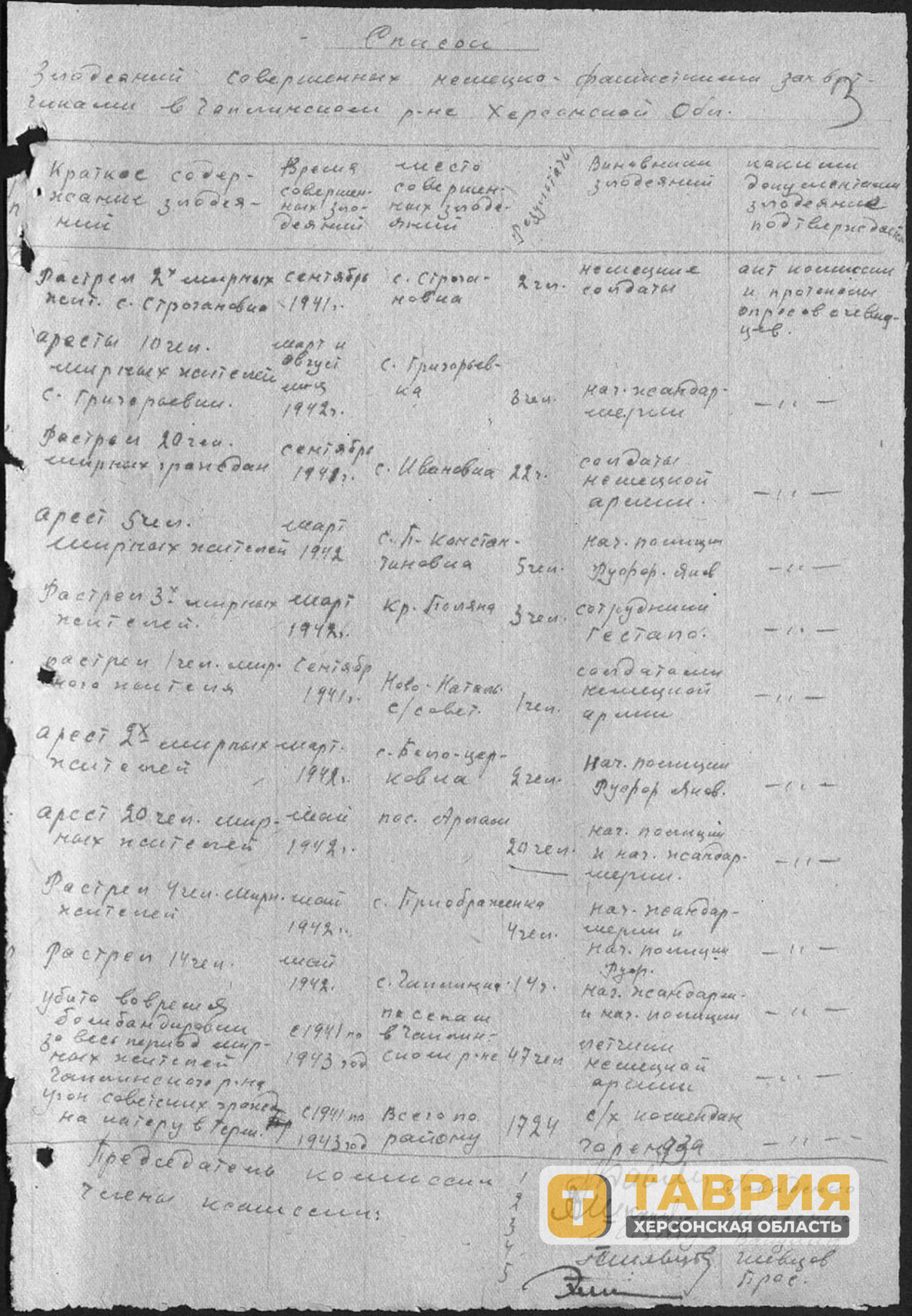 В распоряжении «Таврии» также оказался доклад о злодеяниях немецко-фашистских захватчиков в Геническом районе Херсонской области. Преступления совершали сотрудники Гестапо, немецкие солдаты не из частей СС, назначенная нацистами полиция из числа украинского населения.