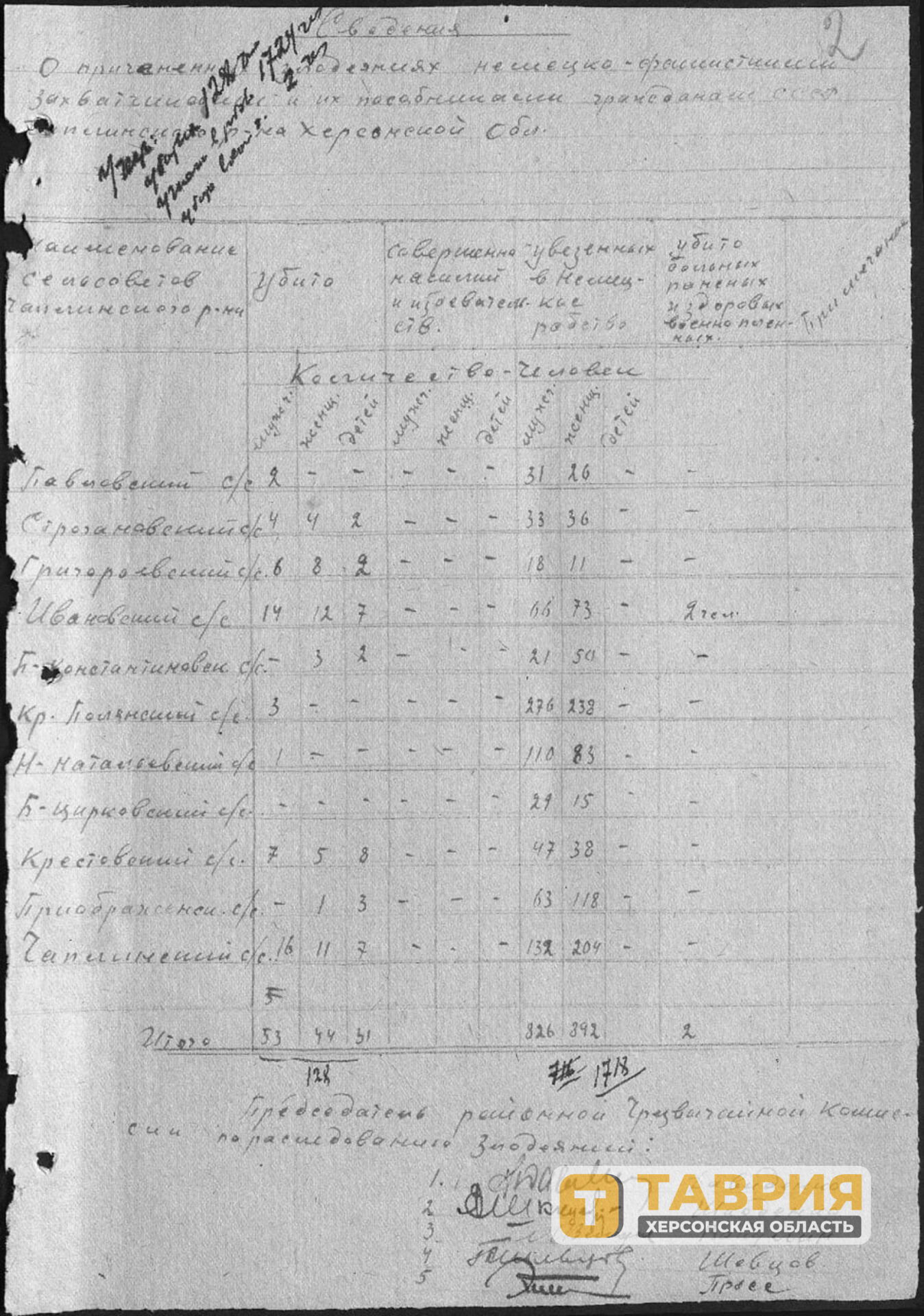 В архиве подробно описано количество угнанных в рабство людей по каждому из сельских советов Чаплинского района.