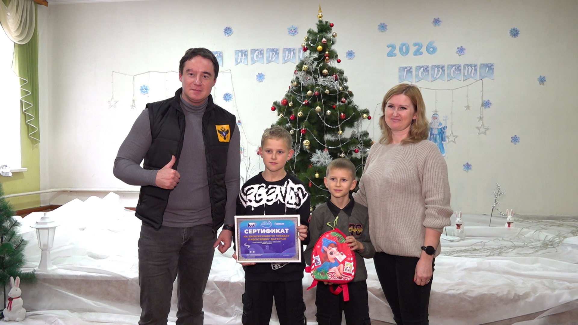 Поездку планируют на весну или лето, чтобы она совпала с каникулами. Семье вручили сертификат на поездку, а также новогодний подарок для детей от губернатора Владимира Сальдо.