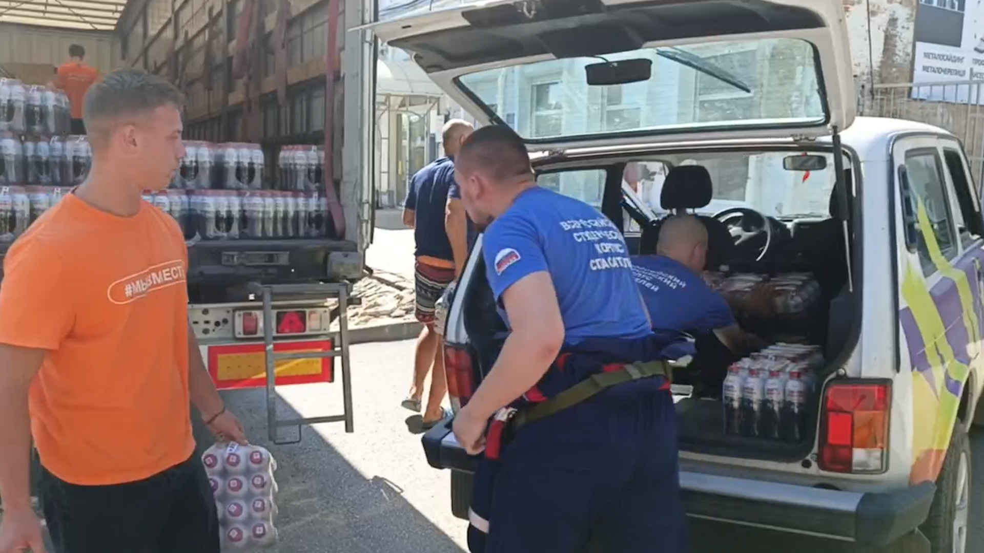 В разгрузке шести палет, прибывших в Геническ, приняли участие добровольцы, в том числе участники Всероссийского студенческого корпуса спасателей, студенты техникума сферы обслуживания и представители молодежной организации «Юг молодой».