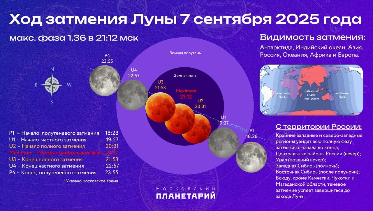 21:12 — Максимальная фаза затмения. Момент наибольшего погружения и самого насыщенного красного цвета. Северный край Луны, который пройдет ближе к центру земной тени, будет заметно темнее.