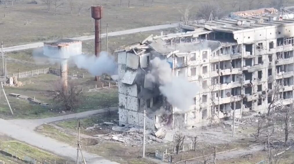 В сторону многоэтажке с левого берега Днепра выдвинулся рой FPV-дронов. По очереди несколько БПЛА врезались в укрытие ВСУ, в результате полностью обвалив здание. ВСУ остались под завалами.