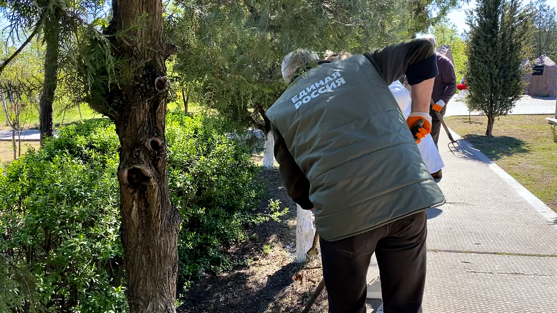 К уборке присоединились работники культуры и образования, областные и муниципальные депутаты, сотрудники коммунальных служб и волонтеры, а также съемочная группа ТРК «Таврия». Участники побелили деревья, убрали прошлогоднюю листву и сухостой, собрали мусор и привели в порядок дорожки.