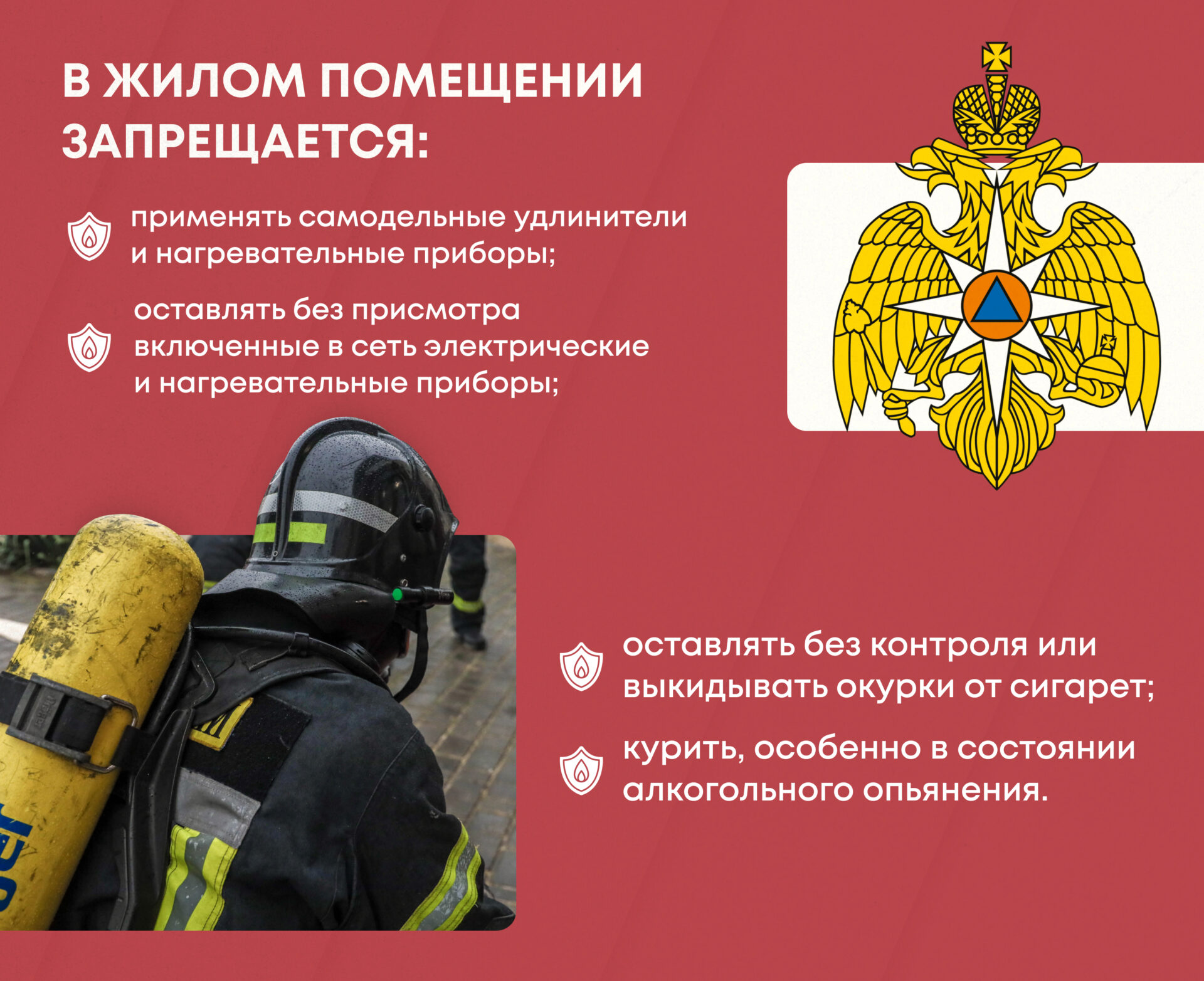 <p>«Основными причинами возгораний в жилье часто становятся неосторожность при курении и нарушение правил эксплуатации электроприборов. Запрещается курить в жилых помещениях, особенно в состоянии алкогольного опьянения, и оставлять без контроля или выкидывать окурки от сигарет. При использовании электрооборудования запрещается применять самодельные нагревательные приборы и удлинители, а также оставлять без присмотра включенные в сеть электроутюги, плитки, чайники и другие устройства без тепловой защиты. Помните: нарушение этих правил может привести к трагическим последствиям», — говорится в сообщении.</p>