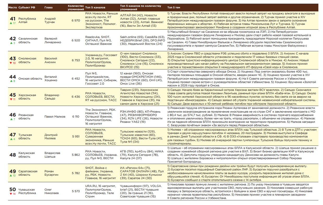 «На 45-м месте губернатор Херсонской области Владимир Сальдо – по-прежнему доминируют фронтовые сводки и чрезвычайная повестка; резонанс вызвало заявление Сальдо о начале операции по освобождению Херсона – по его словам, российские войска уже контролируют часть города на левом берегу», — говорится в сообщении.