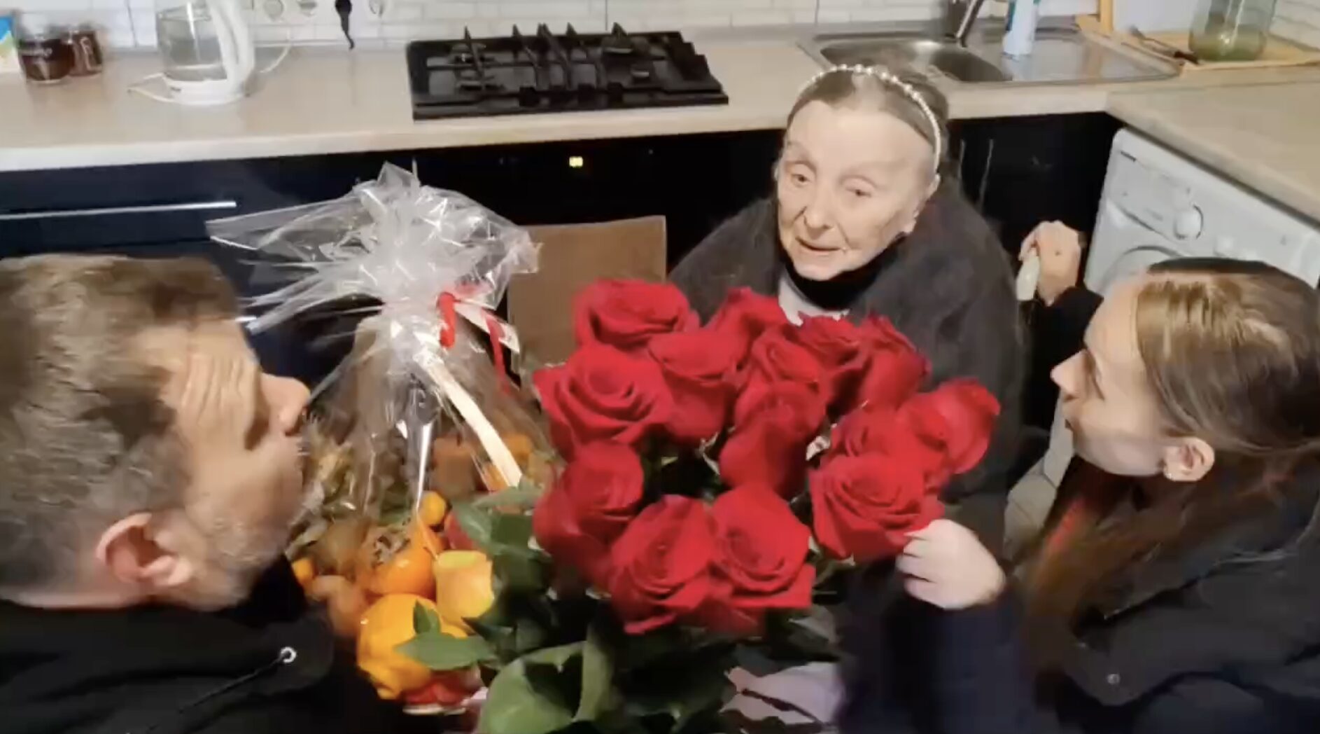 Помощник сенатора доставил долгожительнице цветы и фрукты. Сейчас женщина проживает в Скадовске, куда эвакуировалась из Херсона.