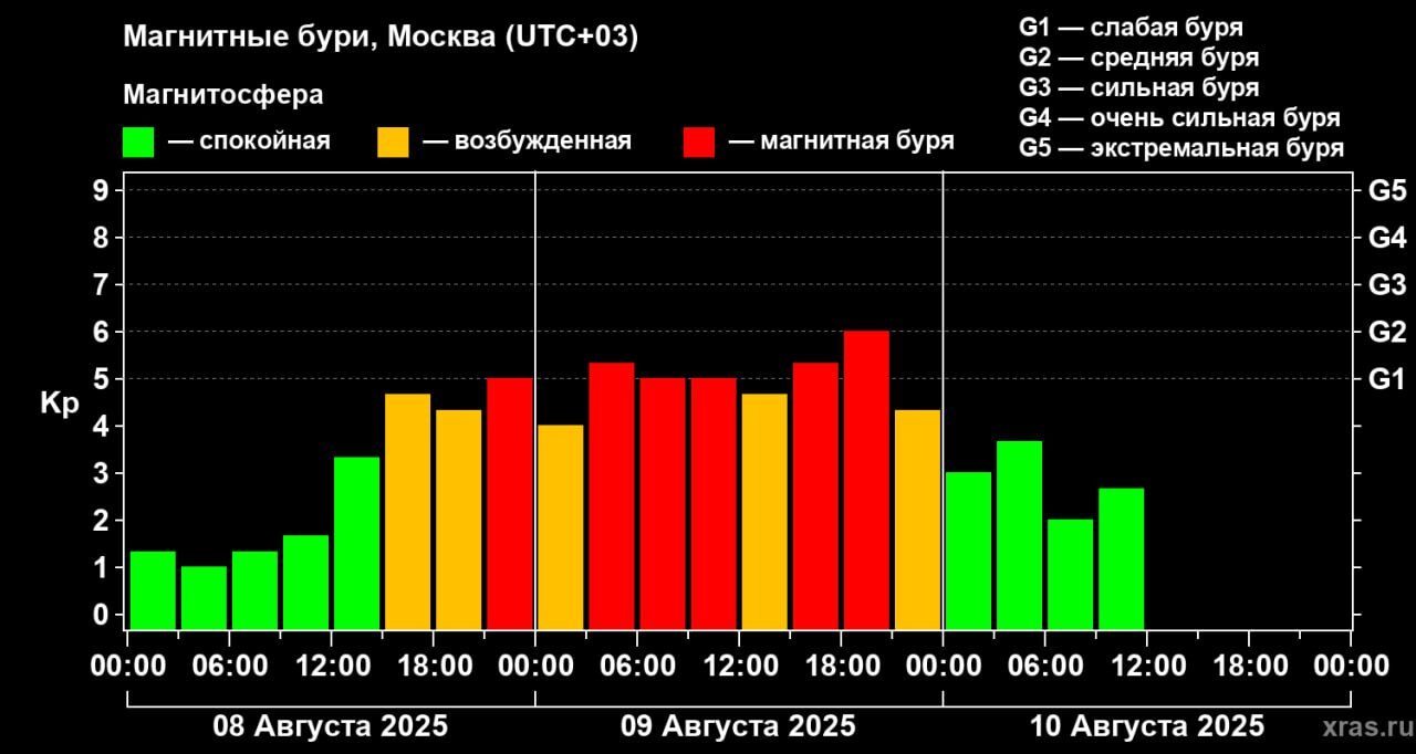 «По состоянию на утро 10 августа по московскому времени геомагнитная обстановка полностью стабилизировалась. Наблюдаются скачки температуры и индукции межпланетного магнитного поля. В связи с этим сохраняются риски геомагнитных возмущений, которые будут присутствовать до середины будущей недели», — сообщили в ИКИ РАН.